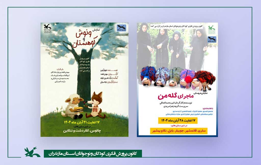 به گزارش خبرگزاری کودک پرس، استان مازندران، دو نمایش «ماجرای گله من» به کارگردانی امیرمحمد انصافی و «ونوش و کوهستان» به کارگردانی مهدی قلعه از تولیدات مرکز تولید تئاتر و تئاتر عروسکی کانون پرورش فکری ، از ۱۷ تا ۲۸ آبانماه ۱۴۰۴ در شهرستانهای استان اجرا میشوند.