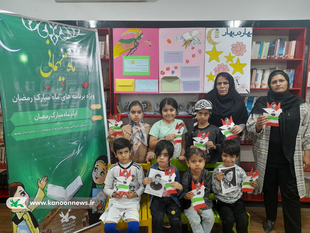 در این برنامه، دو نوجوان شهید شهرستان دشتی، شهید عبدالله سروری مطلق و شهید مصطفی انجمن افروز به اعضای مرکز معرفی شدند. همچنین، کودکان و نوجوانان با ساخت کاردستی گل، کبوتر، پرچم و تصاویر شهدا، ارادت خود را به مقام والای شهدا ابراز کردند.
