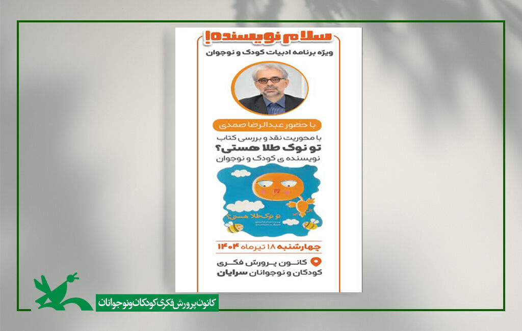 به گزارش روابط عمومی کانون پرورش فکری کودکان و نوجوانان خراسان جنوبی؛ همزمان با ۱۸ تیرماه، روز ادبیات کودک و نوجوان، نشست نقد و بررسی کتاب «تو نوک طلا هستی» نوشته عبدالرضا صمدی، با حضور نویسنده در کانون پرورش فکری کودکان و نوجوانان شهرستان سرایان برگزار شد.