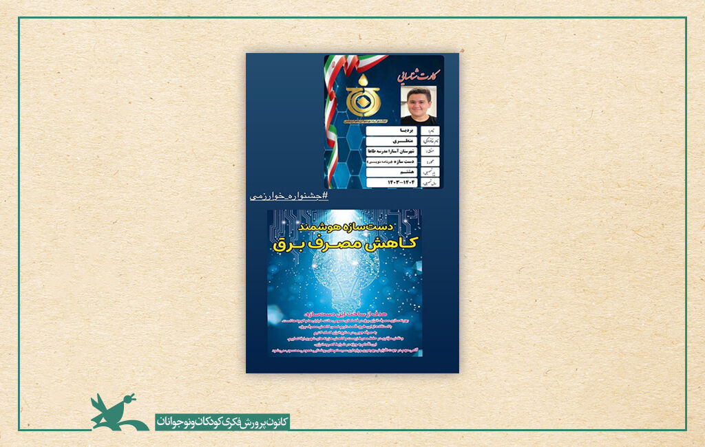 روند ارایه و انتخاب طرح خلاقانه «کاهنده مصرف برق» این عضو کانون پرورش فکری کودکان و نوجوانان استان گیلان تا ۶ مرداد ۱۴۰۴ ادامه‌ یافت و با کسب عنوان نخست بخش منطقه‌ای و مقام دوم استانی جشنواره علمی خوارزمی از سوی بردیا منظری همراه‌ شد.