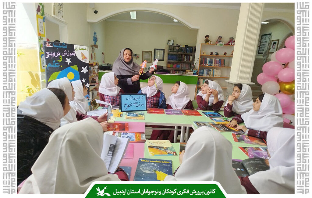 مرکز شماره پنج کانون اردبیل با محوریت کتاب «آسمان شب» برنامه‌ای آموزشی برای آشنایی اعضا با کهکشان‌ها، ستارگان، سیارات و ساختار منظومه شمسی برگزار کرد.