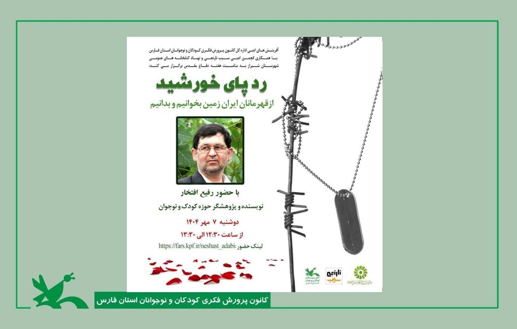 سومین نشست تخصصی «رد پای خورشید» با محوریت ادبیات پایداری و بررسی تأثیر آن بر هویت‌سازی نوجوانان، هفتم مهر ۱۴۰۴، به همت اداره‌کل کانون پرورش فکری کودکان و نوجوانان استان فارس، به صورت مجازی برگزار شد.