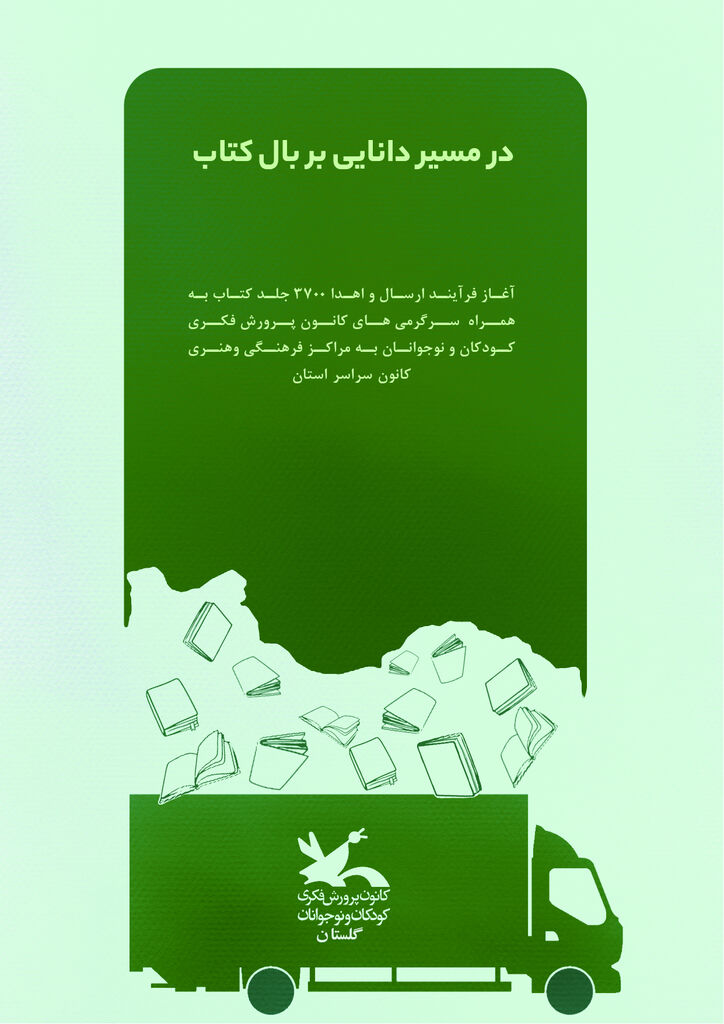 به‌گزارش روابط عمومی اداره‌کل کانون پرورش فکری کودکان و نوجوانان استان گلستان، خواب ابرها، حرف دلم را قورت دادم، پرواز وارونه، آسمان به فکر صلح، خرس کوچولوی قطبی مرا به خانه ببر! از جمله کتاب‌هایی است که به مراکز کانون سراسر کشور ارسال شده است.