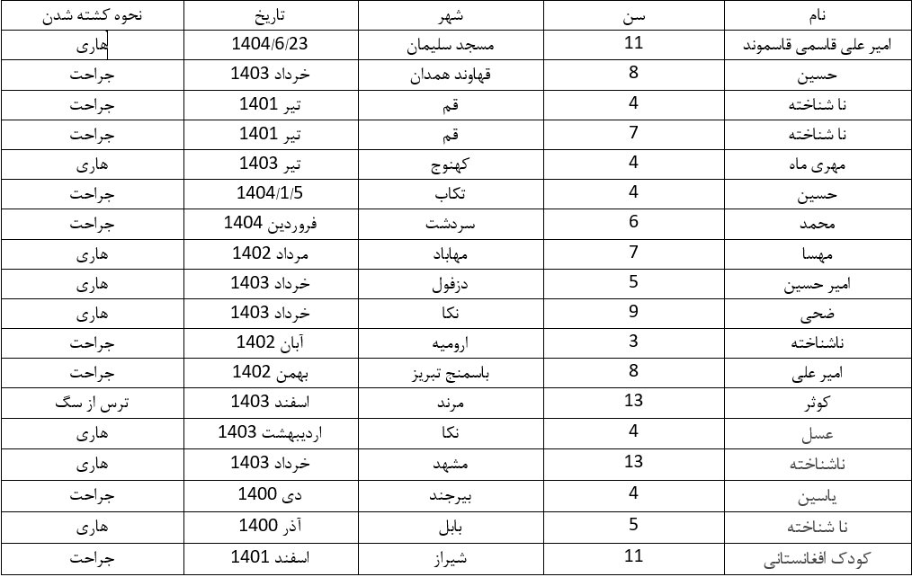 نگرانیهای این استاد دانشگاه در جدولی که مشاهده میکنید، خودش را نشان میدهد، جدولی که تنها براساس اطلاعات رسمی و مستند تهیه شده و فهرست کودکان کشته شده بر اثر گازگرفتگی و حمله سگهای بدون صاحب در سالهای اخیر را نشان میدهد: