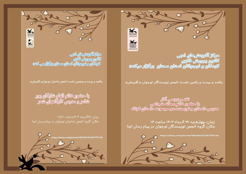 به گزارش روابط عمومی کانون پرورش فکری کودکان و نوجوانان استان سمنان، دو نشست تخصصی از انجمنهای ادبی «آفرینش»، شامل یکصد و بیستوپنجمین نشست انجمن شاعران و یکصد و بیستویکمین نشست انجمن نویسندگان نوجوان، به صورت مجازی و با استقبال پرشور اعضا برگزار گردید.