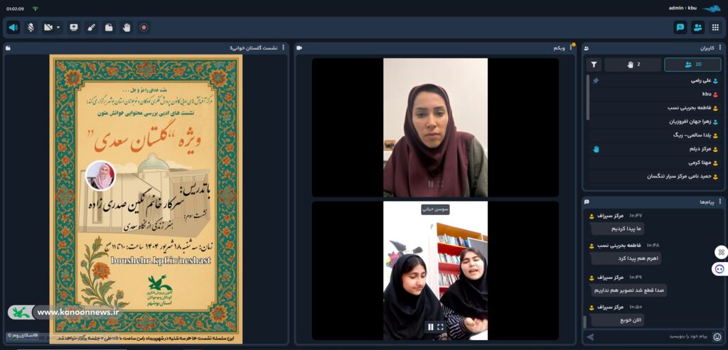 به گزارش روابط عمومی کانون پرورش فکری کودکان و نوجوانان استان بوشهر، سومین نشست مجازی “گلستانخوانی” با محوریت موضوع هنر زندگی از نگاه سعدی روز سهشنبه ۱۸ شهریور ۱۴۰۴ در فضای اسکایروم برگزار شد.