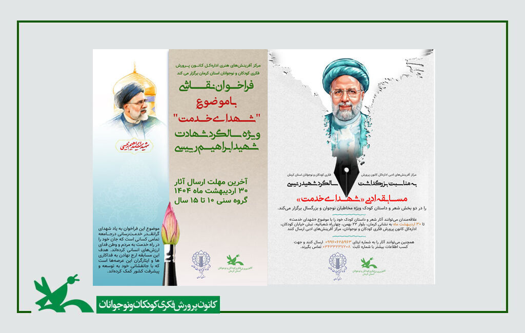 به گزارش خبرگزاری کودک پرس، استان کرمان، این مسابقه به همت واحد آفرینشهای هنری و ادبی ادارهکل کانون و با همکاری شورای هماهنگی تبلیغات اسلامی استان، به مناسبت سالروز شهادت «شهید جمهور»، آیتالله سید ابراهیم رئیسی، در سه بخش نقاشی، شعر و داستان کودک برگزار شد.