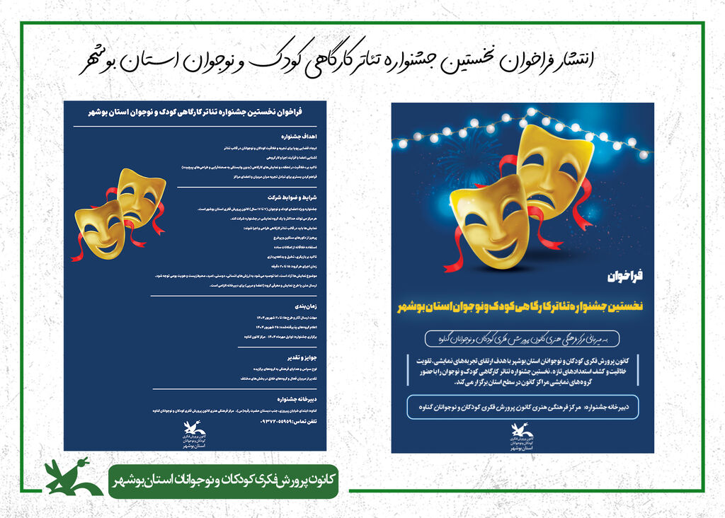 به‌گزارش روابط‌عمومی اداره‌کل کانون پرورش فکری کودکان و نوجوانان استان بوشهر، نخستین جشنواره تئاتر کارگاهی کانون پرورش فکری کودکان و نوجوانان استان بوشهر، با محوریت خلاقیت‌های نمایشی کودکان و نوجوانان، در هفته‌ی اول آذرماه ۱۴۰۴ برگزار می‌شود.