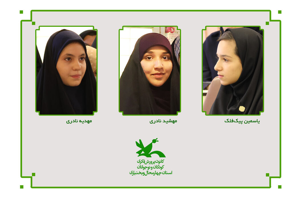 کارشناس آفرینشهای ادبی کانون پرورش فکری کودکان و نوجوانان استان در ادامه اسامی برگزیدگان چهارمحال و بختیاری را اینگونه اعلام کرد: «مهدیه نادری و مهشید نادری»، هر دو از مرکز بن و «یاسمن پیک فلک» از مرکز شماره سه شهرکرد موفق به کسب رتبهی برتر در این رویداد ادبی شدند.