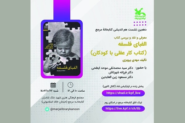نشست «الفبای فلسفه: کتاب کار عقلی با کودکان»، شنبه (۲۲ دیماه ۱۴۰۳) ساعت ۱۰ تا ۱۲ در کتابخانه مرجع کانون پرورش فکری واقع در خیابان شهید بهشتی، خیابان خالداسلامبولی، پلاک ۲۴، مجتمع فرهنگیهنری شهید ملکشامران کانون برگزار میشود.