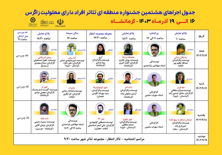جدول اجراهای هشتمین جشنواره تئاتر منطقهای افراد دارای معلولیت “زاگرس” منتشر شد.