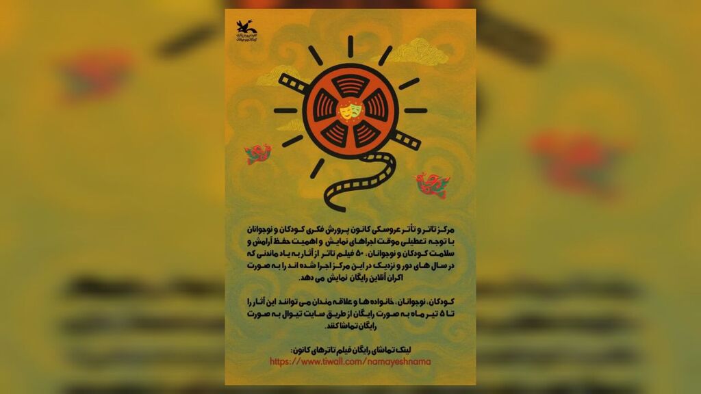 مرکز تولید تئاتر و تئاتر عروسکی کانون پرورش فکری با توجه تعطیلی موقت اجراهای نمایش و اهمیتِ حفظ آرامش و سلامت کودکان و نوجوانان، ۵۰ فیلمتئاتر از آثار بهیاد ماندنی که در سالهای دور و نزدیک در این مرکز اجرا شدهاند را به صورت آنلاین و رایگان نمایش میدهد.