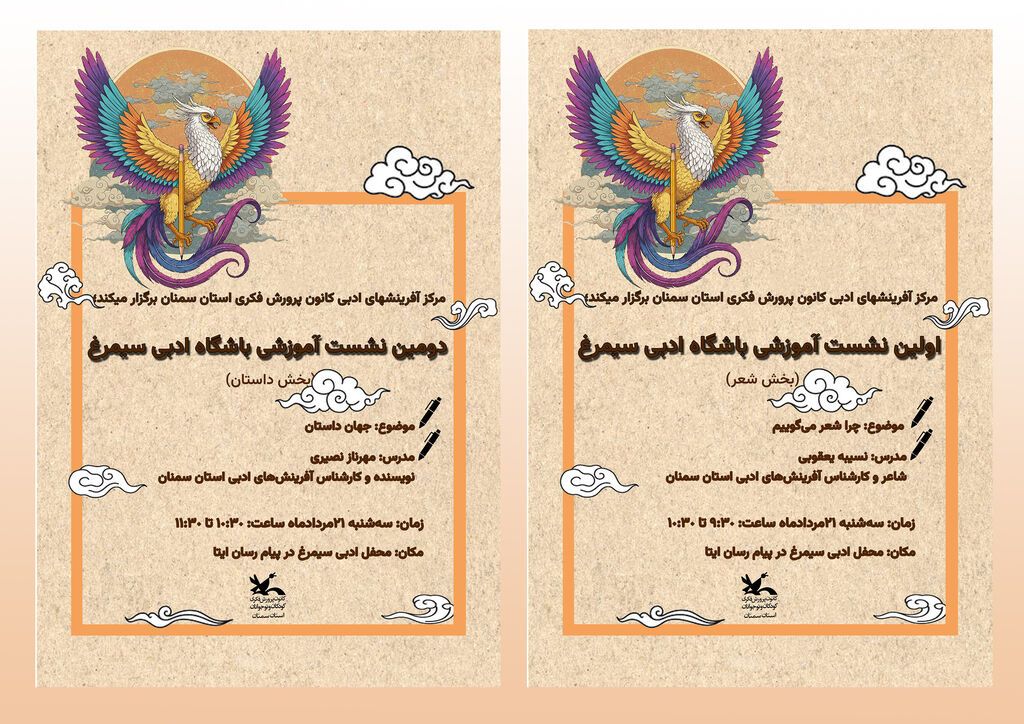 به گزارش روابط عمومی کانون پرورش فکری کودکان و نوجوانان استان سمنان، مرکز آفرینشهای ادبی کانون پرورش فکری استان سمنان، در راستای تداوم فعالیتهای شاخص خود و در جهت شکوفایی استعدادهای ادبی آیندهسازان ایران، روز سهشنبه ۲۱ مردادماه، دو نشست آموزشی مجازی را در باشگاه ادبی سیمرغ برگزار کرد.