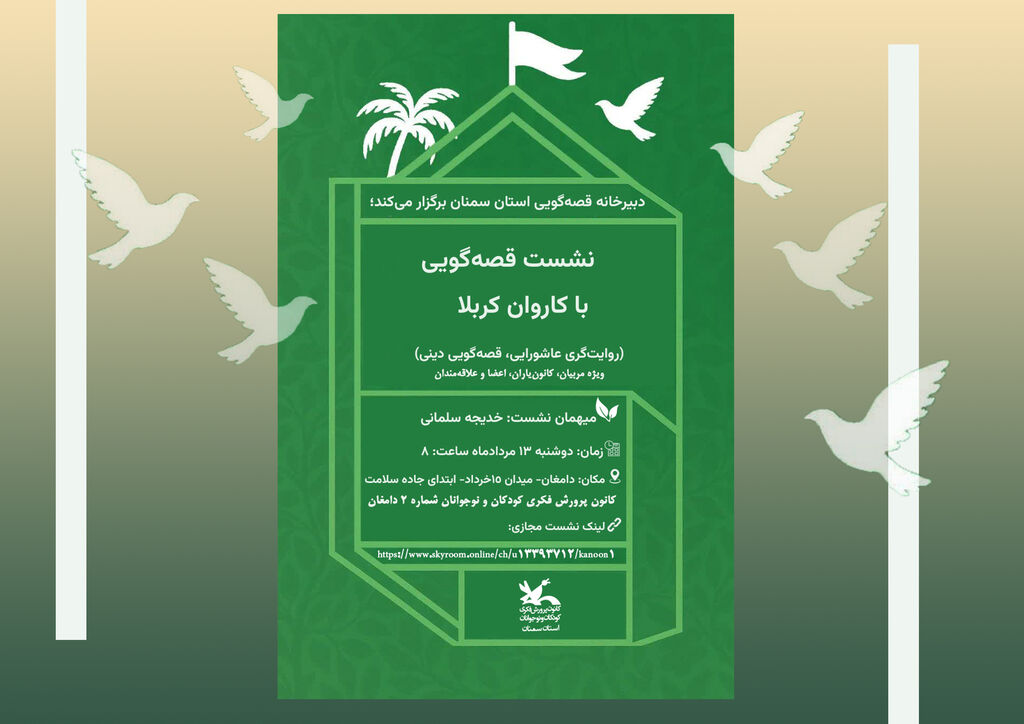 به گزارش روابط عمومی کانون پرورش فکری کودکان و نوجوانان استان سمنان، دبیرخانه قصهگویی کانون پرورش فکری کودکان و نوجوانان استان سمنان، همزمان با ایام شهادت مظلومانه حضرت رقیه (س)، نشست تخصصی قصهگویی با عنوان «با کاروان کربلا» را با محوریت قصههای دینی و روایتگری عاشورا برگزار میکند. این نشست با حضور قصه گوی برجسته کشوری، خدیجه سلمانی، فرصتی بینظیر برای علاقهمندان به هنر قصهگویی و ادبیات آیینی فراهم آورده است.