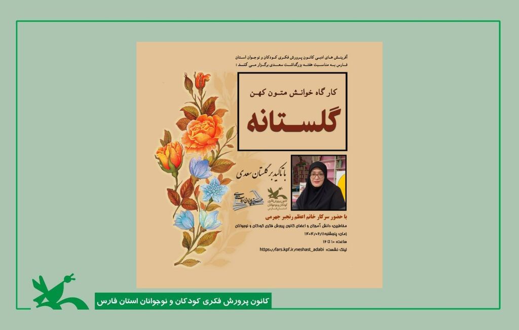 به گزارش روابط‌عمومی اداره‌کل کانون پرورش فکری کودکان و نوجوانان استان فارس، در  ۱۱ اردیبهشت ۱۴۰۴، کارگاه خوانش متون گلستانه به‌صورت مجازی و با حضور اعظم رنجبر جهرمی، نویسنده و پژوهشگر برجسته، برگزار شد.