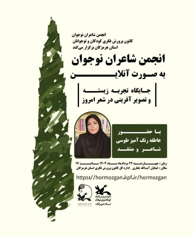 این شاعر و منتقد ادبی ضمن خوانش اشعار خود، نوجوانان شاعر را به مطالعه آثار شاعران بزرگ تشویق کرد. لازم به ذکر است؛ عاطفه رنگ آمیز طوسی متولد سال ۱۳۵۹ در شهر مشهد است و مجموعه شعر از روزهای نیستی و باران را منتشر نموده است.