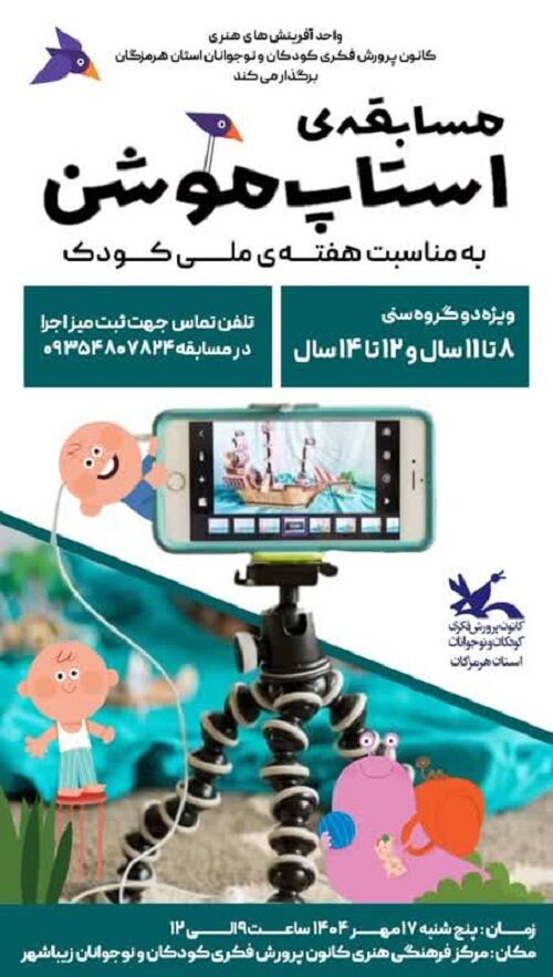 به گزارش خبرگزاری کودک پرس، هرمزگان؛ مسابقه ی استاپ موشن ویژه دو گروه ۸تا۱۱سال و ۱۲ تا۱۴ سال به مناسبت هفته ی ملی کودک در کانون پرورش فکری کودکان و نوجوانان استان هرمزگان برگزار خواهد شد.