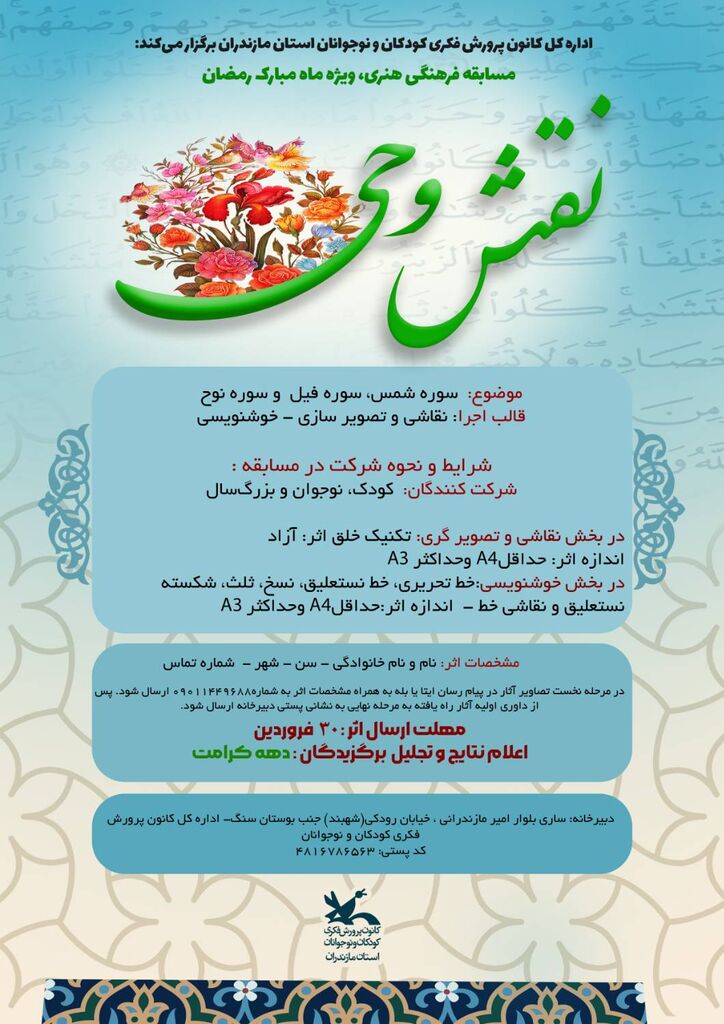 به گزارش خبرگزاری کودک پرس، استان مازندران، به مناسبت ماه مبارک رمضان مسابقه فرهنگی هنری نقش وحی با هدف آشنایی کودکان و نوجوانان با فضلیت ماه مبارک رمضان در قالب فعالیت های فرهنگی و هنری برگزار شد.