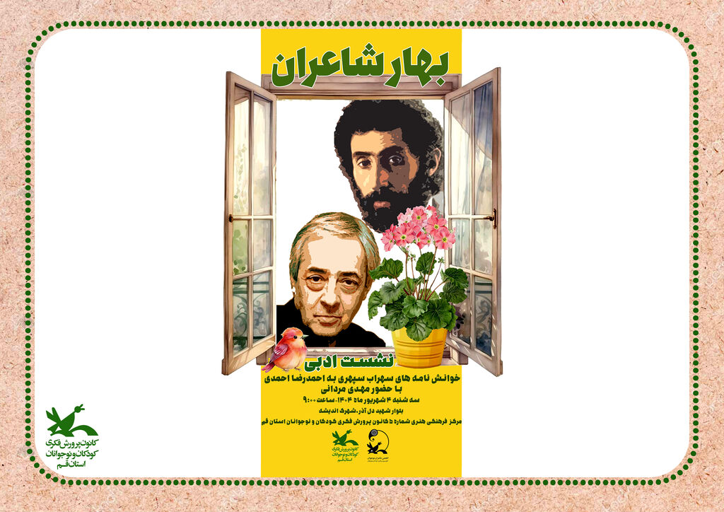 به گزارش روابط عمومی کانون پرورش فکری کودکان ونوجوانان استان قم، سه شنبه ۴ شهریور ماه ۱۴۰۴، نشست ادبی بهار شاعران با محوریت خوانش نامه های سهراب سپهری به احمد رضا احمدی را با حضور مهدی مردانی، علیرضا خضری فرد مدیر کل کانون، شهرزاد حدادپور معاون فرهنگی اجرایی، نگار قربانی، مسئول حراست استان، اکرم الف خانی کارشناس ادبی استان، اعضای مستعد ادبی و مربیان مراکز فرهنگی هنری کانون استان در مرکز فرهنگی هنری شماره ۵ کانون برگزار شد. در ابتدای شروع نشست ضمن خوش آمد گویی توسط اکرم الف خانی، کارشناس ادبی استان و دیگر اعضا و مربیان، کلیپی در راستای معرفی احمد رضا احمدی و زندگی و آثار او پخش شد. در ادامه الف خانی عنوان کرد، انتخاب این موضوع برای نشست در جهت علاقه ی اعضای نوجوان به گرایش قالب شعر های آزاد و اهمیت شعر نیمایی در این راستا بود. مهدی مردانی گفت:جایی که بشر اولیه آواهای معنی دار تولید می کند که تصویر ذهنی دارد و آن جا حد فاصل انسان و سایر موجودات «زبان» است. وی سپس به نقش و اهمیت ساختارشکنی نیما یوشیج در قالب اشاره کرد که سبب شده است، سایر موضوعات اجتماعی در قالب به راحتی بیان شود. نیما آگاهانه تمام بنیادها و ساختارهای شعر کهن فارسی را به چالش کشید وباعث شد تا پدیده هایی چون احمد شاملو، سهراب سپهری، اخوان ثالث، فروغ فرخزاد و…به جامعه ادبی معرفی شوند. گفتگو با سوال و پاسخ مهدی مردانی و اعضا درباره عدم لزوم خواندن اولیه شعرهای موزون برای نوشتن شعر سپید و نیمایی با مثال شاعری چون گروس عبدالملکیان ادامه پیدا کرد. پنجره دوم این نشست به نقد و بررسی آثار اعضا زهره علئی، الهه قره گوزلو، صدرا اخلاقی و محمد نیما مهجور پرداخته شد و اعضا و شاعر میهمان درباره زبان امروزی، ایجاز و کشف آثار صحبت کردند.