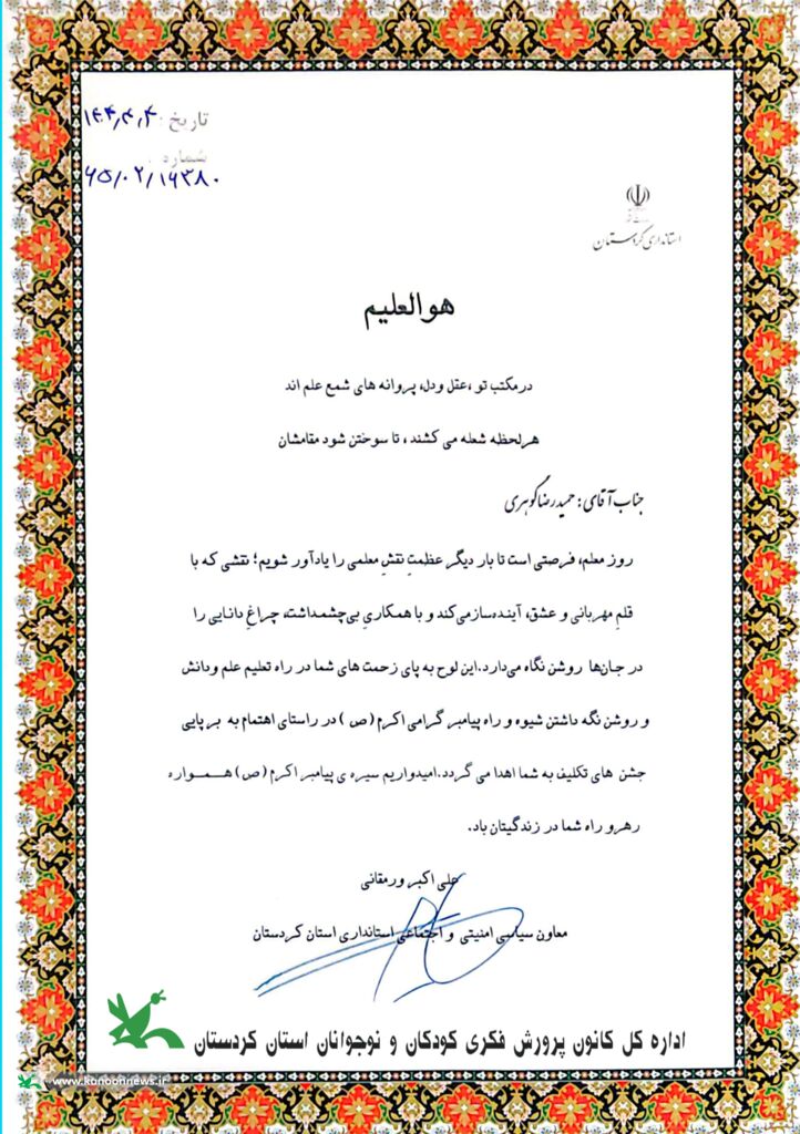 به گزارش روابط عمومی کانون پرورش فکری کودکان و نوجوانان استان کردستان، در پی برگزاری شایسته و هدفمند جشنهای معنوی تکلیف در مراکز فرهنگی، اماکن مذهبی و با مشارکت سازمانهای مردمنهاد، از تلاشها و اقدامات ارزنده جناب آقای حمیدرضا گوهری، مدیرکل کانون پرورش فکری کودکان و نوجوانان استان کردستان، با اهدای لوح تقدیر از سوی معاون سیاسی، امنیتی و اجتماعی استاندار کردستان تجلیل به عمل آمد.