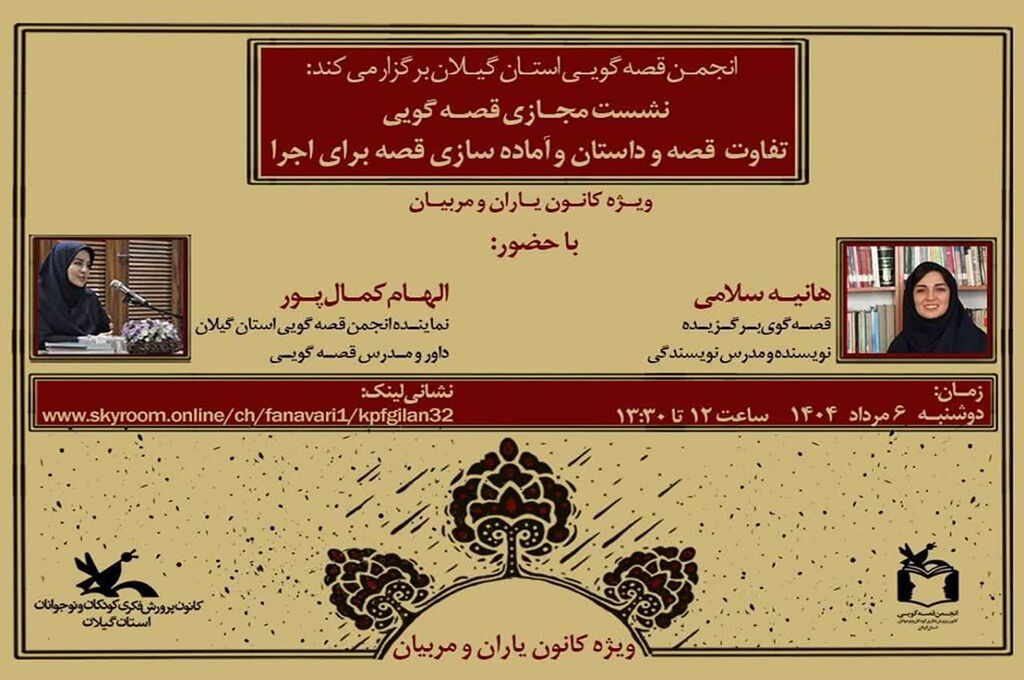 الهام کمالپور، کارشناس فرهنگی و رابط انجمن قصهگویی کانون استان گیلان و هانیه سلامی، قصهگو و نویسنده نیز مدرسان این نشست بودند و درباره تفاوتهای قصه و داستان و اهمیت انتخاب و آمادهسازی آن جهت اجرا برای مخاطبان صحبتکردند.