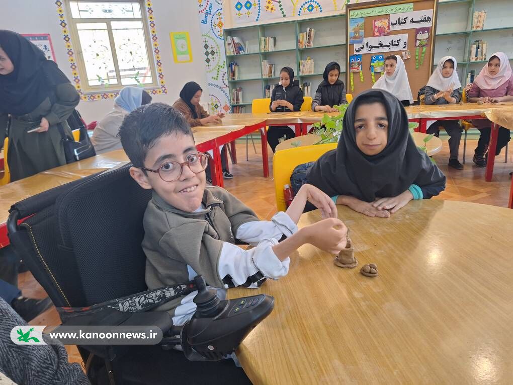 بخش کارگاه هنر و خلاقیت نیز شامل فعالیتهای سفالگری و نقاشی آزاد با موضوع «کتاب مورد علاقهی من» بود. این کارگاه با تجهیزات متناسبسازی شده مانند قلمگیرهای ضخیم، رنگ انگشتی و مواد بافتدار برای کودکان کمبینا و دارای محدودیت حرکتی برگزار شد تا همه اعضا بتوانند با توجه به توانمندیهای خود مشارکت کنند.