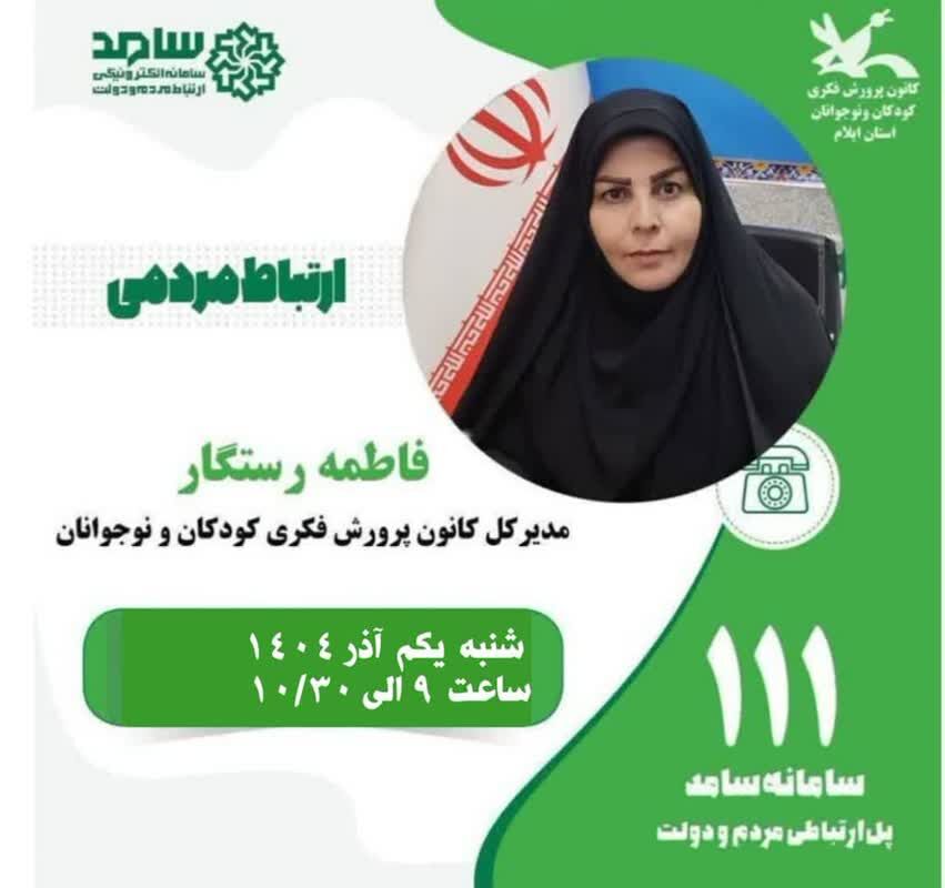 به گزارش روابط عمومی کانون پرورش فکری کودکان ونوجوانان استان ایلام روزشنبه یکم آذر 1404 فاطمه رستگار مدیرکل کانون پرورش فکری کودکان و نوجوانان ایلام با حضور در سامانه الکترونیکی ارتباط مردم و دولت(سامد) بصورت تلفنی پاسخگوی مردم استان خواهد بود.