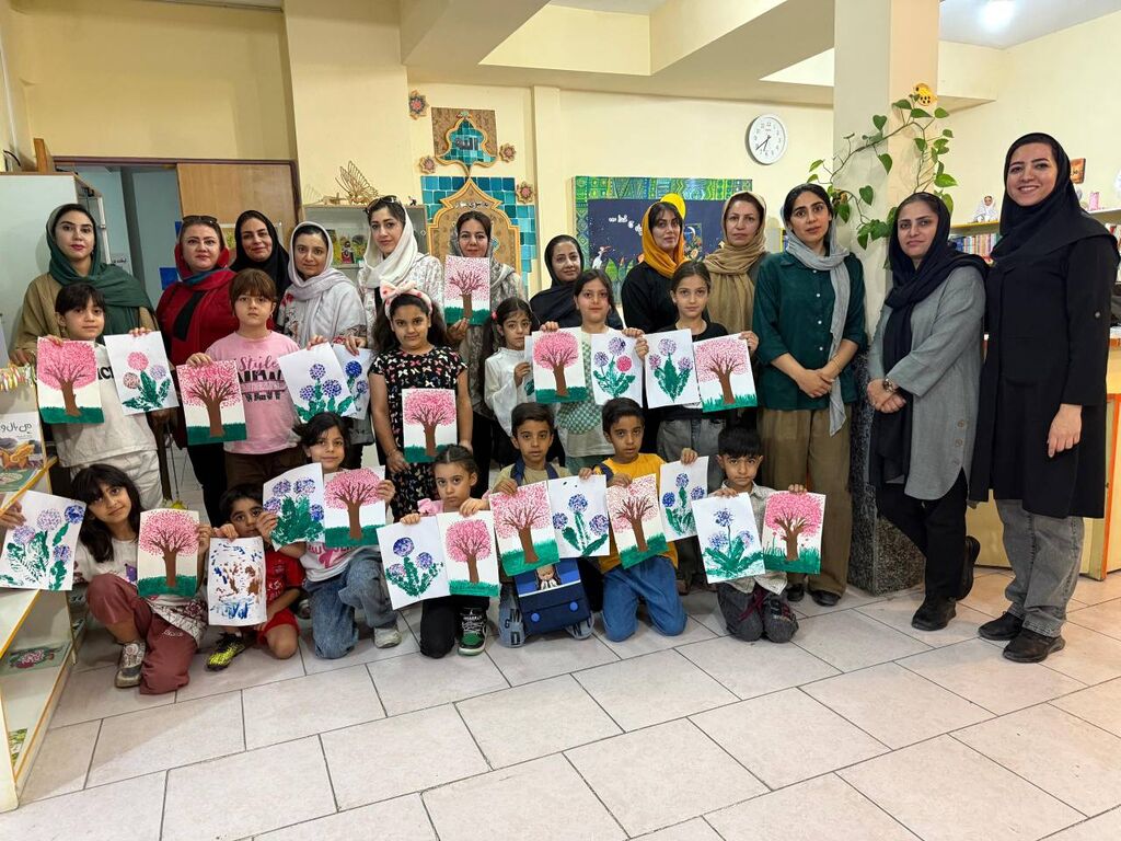 ابتدا کودکان همراه با والدین خود نقاشی درخت پرشکوفه را تجربه کردند؛ فعالیتی که علاوه بر آموزش تکنیکهای رنگآمیزی، فرصت تمرکز و افزایش دقت را برای کودکان فراهم آورد. تکنیک استفاده از گوشپاککن برای خلق شکوفهها با رنگهای متنوع، روشی نوآورانه و ساده بود که به افزایش هماهنگی چشم و دست کودکان کمک کرد. به کارگیری دو رنگ صورتی با شدت متفاوت به منظور ایجاد عمق و بعد در نقاشی، علاوه بر آموزش ترکیب رنگ، توانایی تفکیک رنگها و شناخت طیفهای رنگی را در کودکان تقویت کرد.