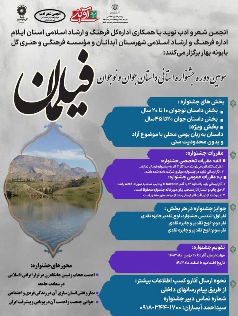 برای اساس این خبراین جشنواره درراستای تحقق سیاست های وزارت فرهنگ و ارشاد اسلامی و با توجه به پتانسیلهای فرهنگی در شهرستان آبدانان و با هدف کشف استعدادهای برتر جوان و نوجوان و پاسداشت آثار ارزشمند به میزبانی انجمن ادبی نوید ، اداره کل فرهنگ و ارشاد اسلامی استان و اداره فرهنگ و ارشاد اسلامی آبدانان برگزارشد.