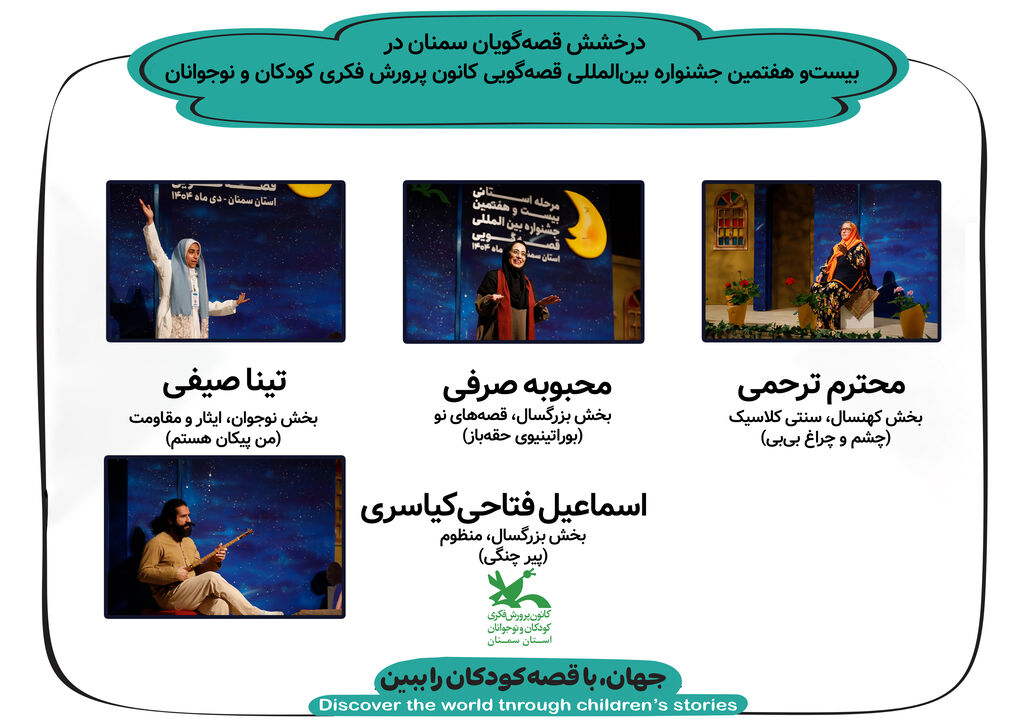 به گزارش روابط عمومی کانون پرورش فکری کودکان و نوجوانان استان سمنان، با پایان مرحله ملی بیستوهفتمین جشنواره بینالمللی قصهگویی و اعلام نتایج داوران، قصهگویان برگزیده در بخشهای گوناگون معرفی شدند و قصهگویان استان سمنان نیز بار دیگر در جمع چهرههای درخشان این رقابت قرار گرفتند.