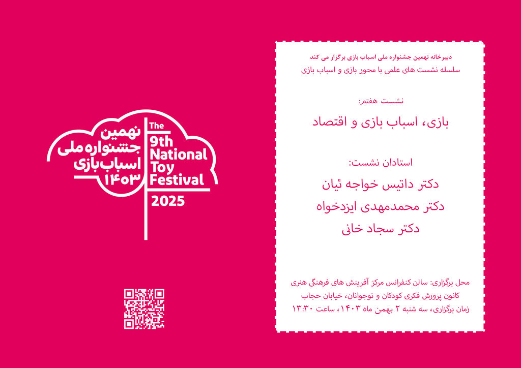 نشست «بازی، اسباببازی، دین و باورهای مذهبی» نیز ساعت ۱۵ تا ۱۶:۳۰ با حضور فرزانه فخریان مدیرعامل بنیاد ملی پویانمایی ایران، مسعود زینالعابدین دکتری رشته فلسفه و کلام اسلامی و مشاور مدیرعامل کانون پرورش فکری کودکان و نوجوانان و اسماعیل پناهی عضو گروه تخصصی فلسفه هنر فرهنگستان هنر جمهوری اسلامی ایران برگزار خواهد شد.