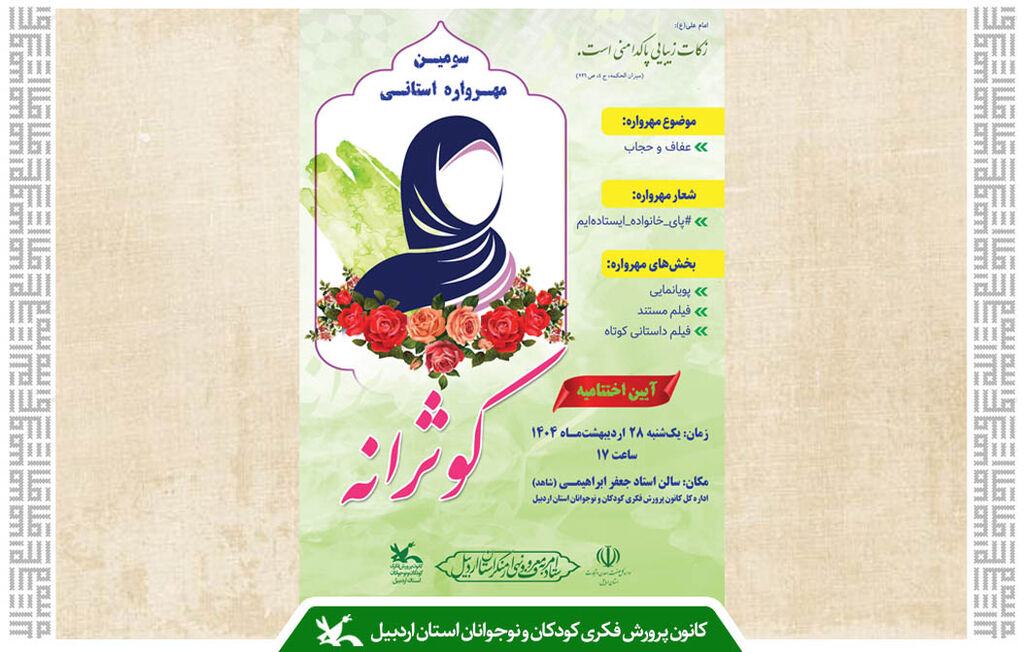 به گزارش خبرگزاری کودک پرس، استان اردبیل، ملیحه ملکزاده فرد، مدیرکل کانون استان در نشست شورای فرهنگی این ادارهکل اعلام کرد: سومین مهرواره «کوثرانه» با تمرکز بر ترویج فرهنگ عفاف و حجاب و با هدف تقویت باورهای دینی، پرورش خلاقیت و شکوفایی استعدادهای کودکان و نوجوانان، روزهای پایانی خود را پشت سر میگذارد و آیین پایانی آن روز یکشنبه ۲۸ اردیبهشتماه برگزار خواهد شد.