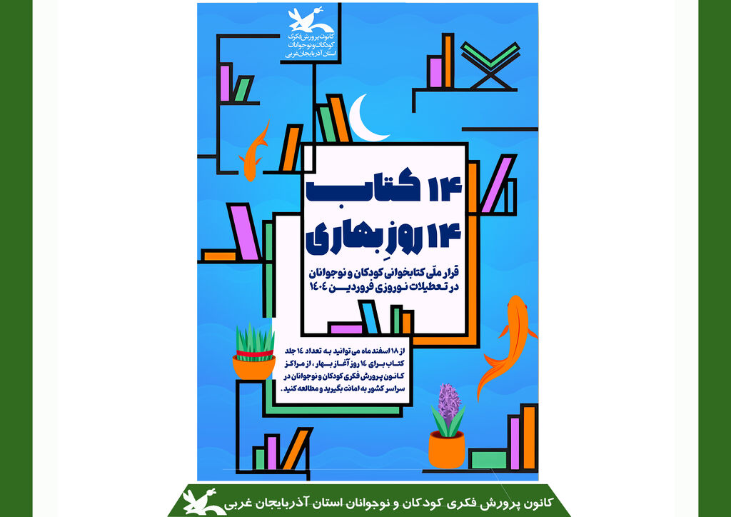به گزارش خبرگزاری کودک پرس، استان آذربایجان غربی؛ با اعلام زهرا آب سوران مدیرکل کانون، کودکان و نوجوانان مراکز کانون پرورش فکری کودکان و نوجوانان استان از ۱۸ اسفند ماه می توانند ۱۴ جلد کتاب از مراکز امانت بگیرند و در ۱۴ روز بهاری آن ها را مطالعه و از خواندن کتاب لذت ببرند.