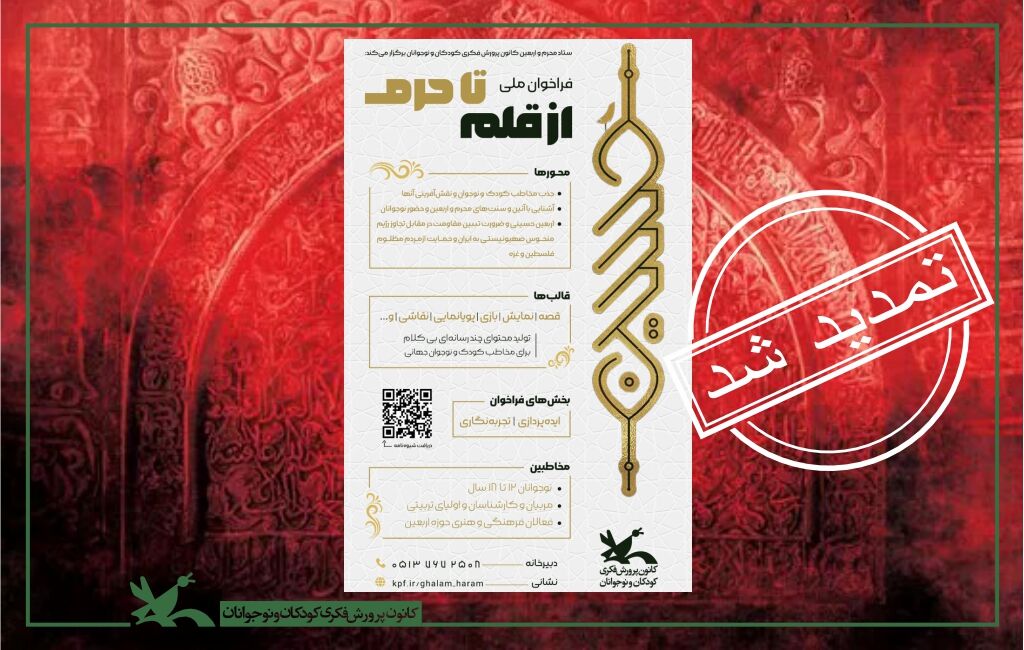 ستاد محرم و اربعین کانون پرورش فکری کودکان و نوجوانان مهلت ارسال اثر به رویداد «از قلم تا حرم» را تا پایان مهر تمدید کرد، در حالی که پیشتر علاقهمندان تا ۳۱ شهریور ۱۴۰۴ فرصت ارسال اثر به این رویداد را داشتند.