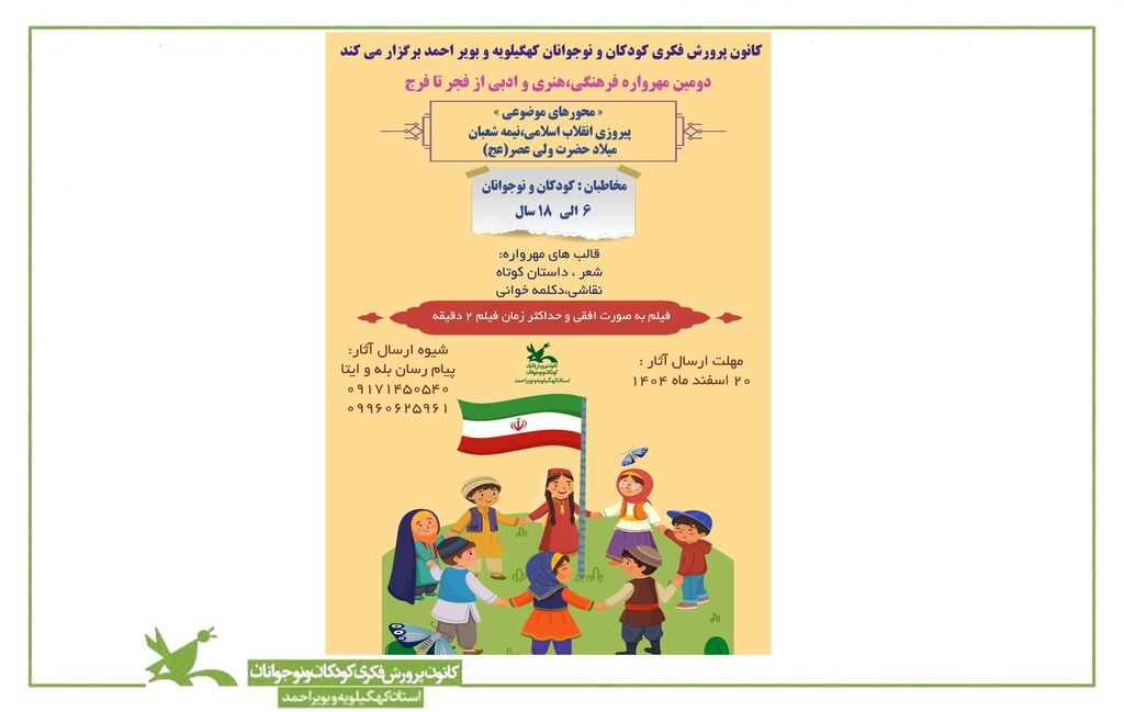 کودکان و نوجوانان میتوانند در قالبهای شعر، داستان کوتاه، نقاشی، دکلمه و فیلمهای کوتاه (حداکثر دو دقیقه) شرکت کنند.