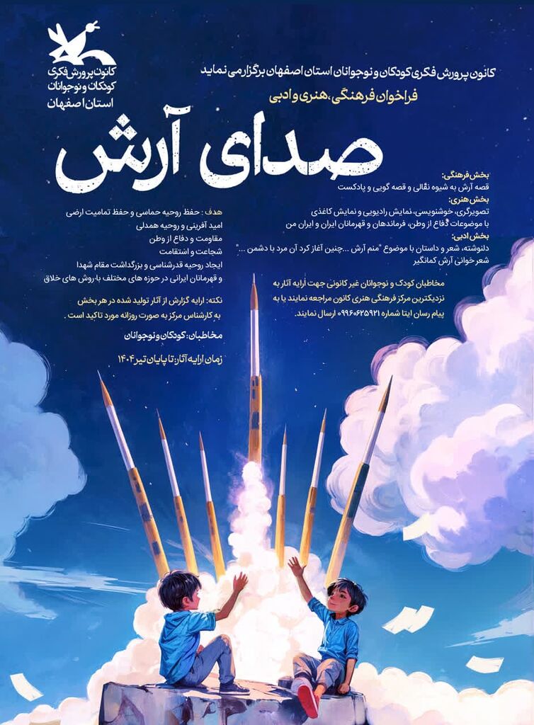 به گزارش خبرگزاری کودک پرس، استان اصفهان، فراخوان “صدای آرش” با هدف تبیین و ترویج روحیهی حماسی در بین کودکان، نوجوانان و خانوادهها و همراهی آنها با رزمندگان دلاور اسلام در دفع حملات ناجوانمردانه و تنبیه رژیم کودککش و نامشروع صهیونیستی و تقویت امید و آرامبخشی منتشر گردید.