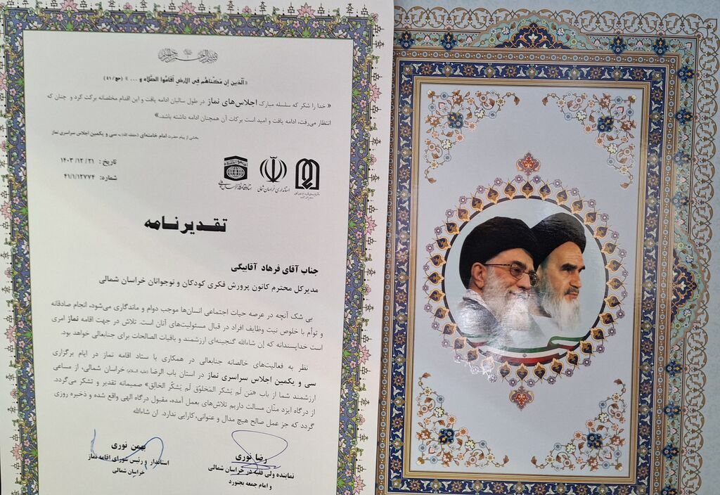 به گزارش خبرگزاری کودک پرس، خراسان شمالی، در این مراسم از تلاش های کانون پرورش فکری کودکان و نوجوانان استان در راستای گسترش فرهنگ اقامه نماز با اهدای لوح سپاس از سوی دکتر سید «احمد زرهانی» قائم مقام ستاد و دبیر اجلاس سراسری نماز و همچنین اهدای لوح سپاس از سوی حجت ااسلام «رضا نوری» نماینده ولی فقیه در خراسان شمالی و امام جمعه بجنورد و «بهمن نوری» استاندار و رئیس شورای اقامه نماز استان تقدیر به عمل آمد.
