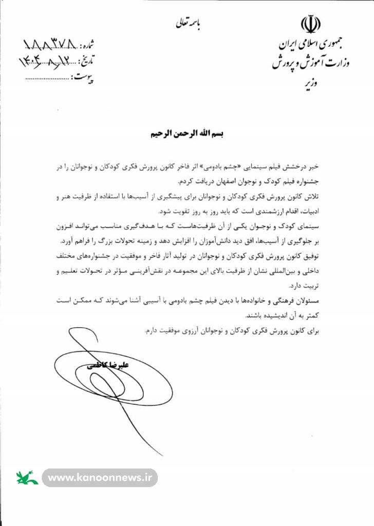 به گزارش خبرگزاری کودک پرس، وزیر آموزش و پرورش در این پیام، درخشش اثر فاخر «چشم بادومی» را نتیجه تلاشهای ارزشمند کانون پرورش فکری در بهرهگیری از ظرفیتهای فرهنگی و هنری برای پیشگیری از آسیبهای اجتماعی دانست و تأکید کرد: «تلاش کانون پرورش فکری کودکان و نوجوانان برای پیشگیری از آسیبها با استفاده از ظرفیت هنر و ادبیات اقدام ارزشمندی است که باید روزبهروز تقویت شود.»