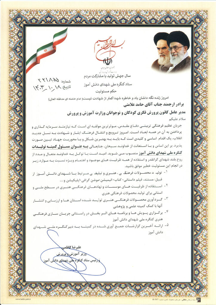 وزیر آموزش و پرورش در این حکم تأکید کرده است: امروز ترویج و انتقال فرهنگ ایثار و شهادت به نسل جدید انقلاب یک اقدام اساسی و کلیدی است که باید به بهترین شکل و با محوریت جهاد تبیین صورت پذیرد.