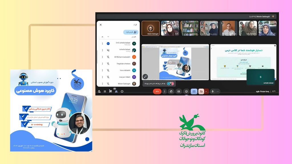 به گزارش روابطعمومی کانون پرورش فکری کودکان و نوجوانان مازندران، دومین دوره آموزشی مصوب استانی با موضوع «کاربرد هوش مصنوعی» در روزهای ۸، ۹، ۱۵ و ۱۶ شهریورماه ۱۴۰۴ به مدت ۸ ساعت آموزشی با تدریس دکتر مبین صباغی رستمی و با حضور مربیان و کارشناسان فرهنگی، هنری و ادبی استان برگزار شد.