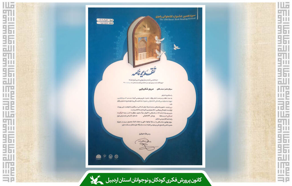 بر اساس این گزارش، در این مراسم، مریم شکیبایی، مربی مسئول مرکز فرهنگیهنری کانون پرورش فکری کودکان و نوجوانان شهرستان نیر، به عنوان یکی از برگزیدگان استانی در بخش پویش کتاب رضوی مورد تقدیر قرار گرفت.