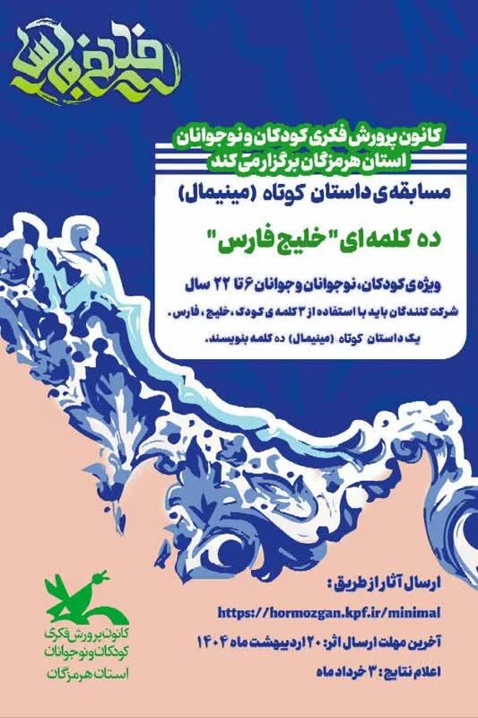 به گزارش روابط عمومی کانون پرورش فکری کودکان و نوجوانان هرمزگان؛ پروین پشتکوهی، مدیرکل کانون هرمزگان گفت: این مسابقه ویژه کودکان، نوجوانان و جوانان6 تا 22 سال است که شرکت کنندگان باید با استفاده از سه “کلمه کودک، خلیج ، فارس“ یک داستان کوتاه (مینیمال) ده کلمه ای بنویسند. پشتکوهی ابراز داشتک آخرین مهلت ارسال آثار 20 اردیبهشت 1404 است.