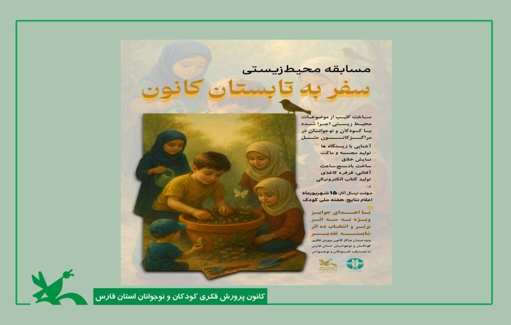 به گزارش روابطعمومی ادارهکل کانون پرورش فکری کودکان و نوجوانان استان فارس، مسابقه فرهنگیآموزشی «سفر به تابستان کانون» با هدف ارتقاء سواد محیطزیستی و پرورش خلاقیت در میان کودکان و نوجوانان استان فارس برگزار میشود.
