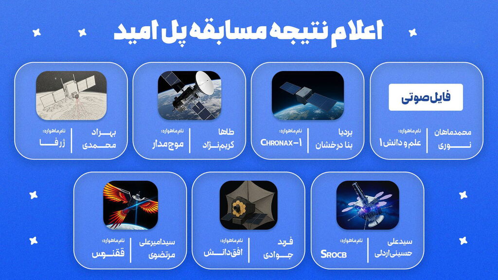 به گزارش خبرگزاری کودک پرس، در این مسابقه، محمدماهان نوری با نام ماهواره «علم و دانش»، بردیا بنادرخشان با نام ماهواره «CHVRONAX-1»، طاها کریمنژاد با نام ماهواره «موج مدار»، بهراد محمدی با نام ماهواره «ژرفاسید»، علی حسینیاردلی با نام ماهواره «SROCB»، فربد جوادی با نام ماهواره «افق دانش» و سیدامیرعلی مرتضوی با نام ماهواره «ققنوس» بهعنوان برگزیدگان پایانی معرفی شدند.