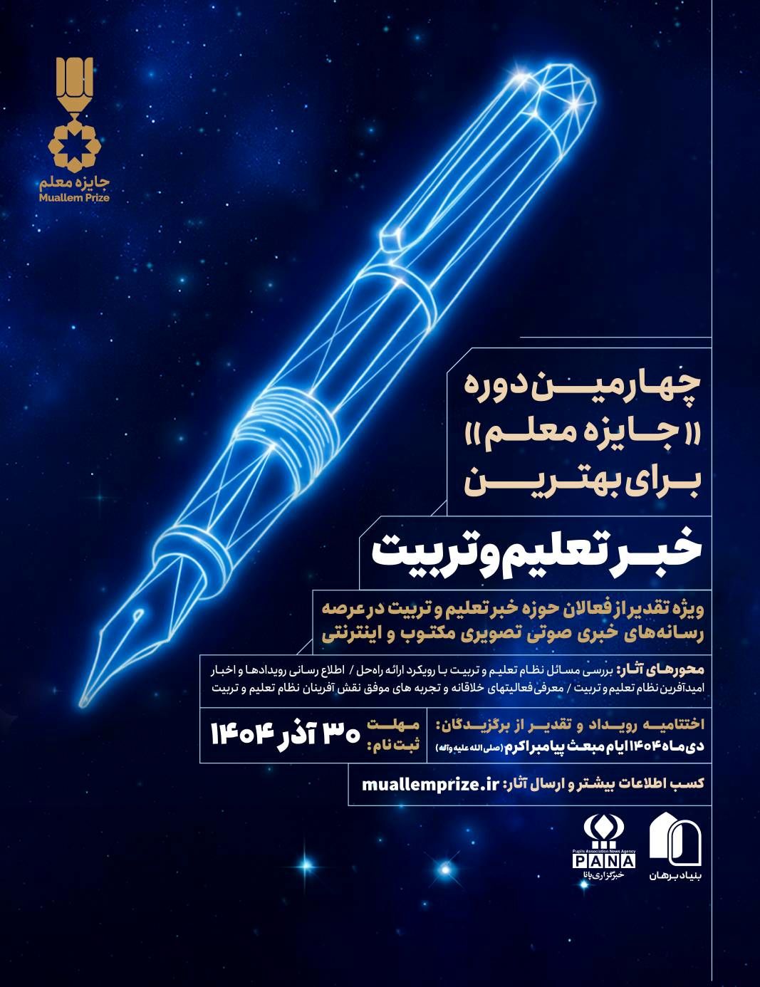 فراخوان «جایزه معلم» با هدف شناسایی و تقدیر از خبرنگاران، روزنامه‌نگاران و فعالان رسانه‌ای حوزه تعلیم‌وتربیت که از ابتدای آذرماه آغاز شده بود، تا روز چهارشنبه سوم دی ماه تمدید شد و علاقه‌مندان می‌توانند آثار خود را تا ۳ دی ۱۴۰۴ از طریق سایت جایزه معلم ارسال کنند.