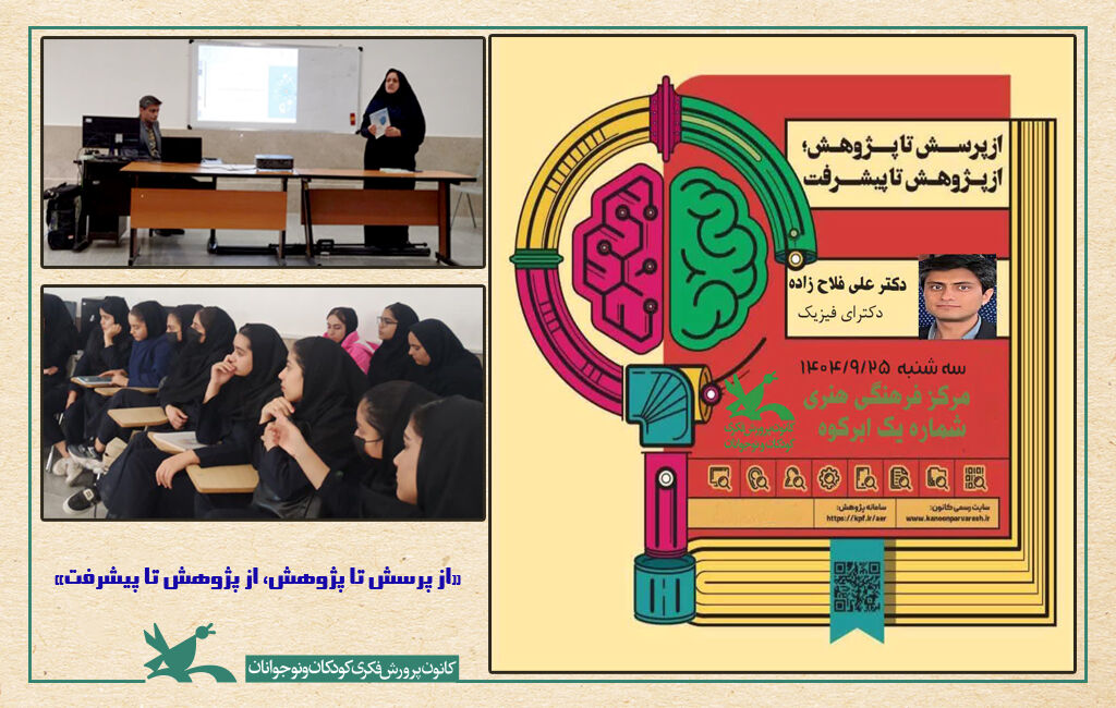 به گزارش خبرگزاری کودک پرس، استان یزد، سه‌شنبه 25 آذر 1404، به مناسبت هفته ملی پژوهش و به همت مرکز فرهنگی هنری شماره یک کانون پرورش فکری کودکان و نوجوانان شهرستان ابرکوه با حضور 50 دانش‌آموز دختر پایه دهم نشست علمی “از پرسش تا پژوهش، از پژوهش تا پیشرفت” برگزار شد.