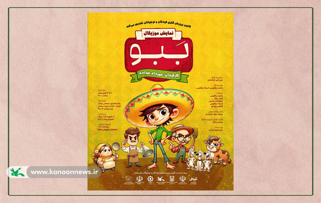 به گزارش خبرگزاری کودک پرس، استان کرمان، نمایش آهنگین و عروسکی «بَبو» به نویسندگی محمد مظلومی و اسما مظلومی و با کارگردانی و تهیهکنندگی مهرداد حدادی، تولید کانون پرورش فکری رفسنجان، از ۱۰ تا ۱۶ اردیبهشت ماه در سالن پلاتو صنعتی کرمان همزمان با دهه مبارک کرامت اجرا خواهد شد.