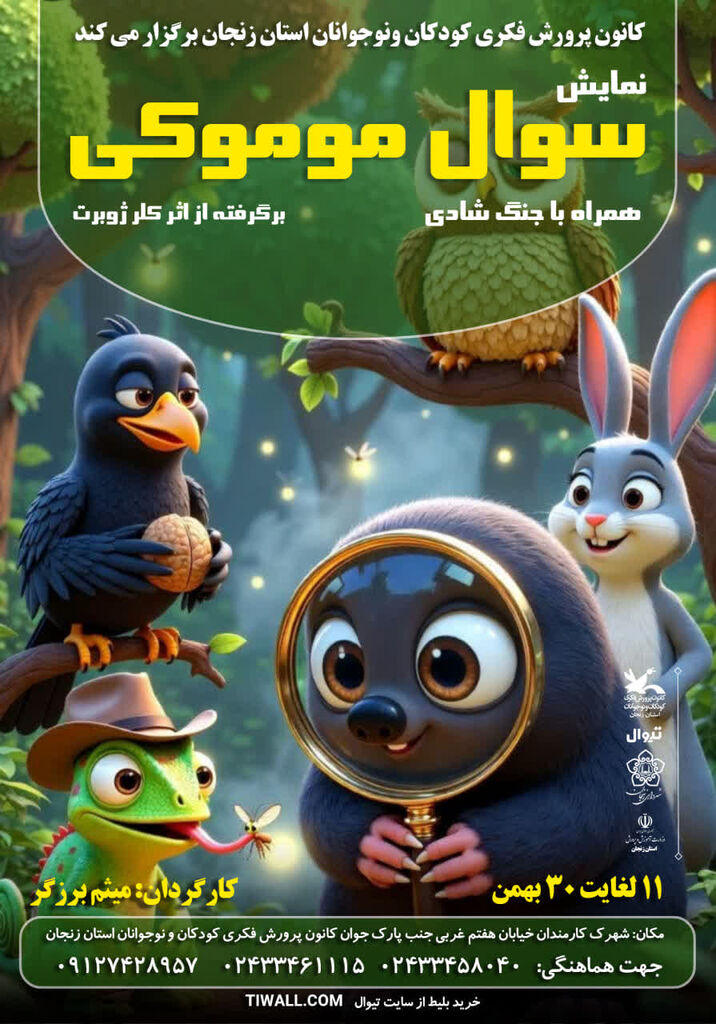 به گزارش خبرگزاری کودک پرس، پرورش فکری استان زنجان؛ همزمان با دهه مبارک فجر انقلاب اسلامی، کانون پرورش فکری کودکان و نوجوانان استان زنجان نمایش شاد و آموزنده «سؤال موموکی» را برای کودکان و خانوادهها روی صحنه میبرد. این نمایش برگرفته از داستانی از کلر ژوبرت است و با رویکردی تربیتی و معنوی، به زبان ساده به یکی از پرسشهای مهم کودکان درباره شناخت خداوند میپردازد.