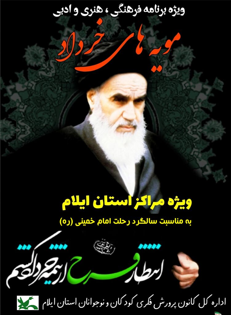 به گزارش روابط عمومی کانون پرورش فکری کودکان ونوجوانان استان ایلام،ویژه برنامه فرهنگی هنری و ادبی«مویه های خرداد» به مناسبت سالگرد ارتحال ملکوتی حضرت امام خمینی (ره) و تجدید میثاق با آرمانهای بنیانگذار جمهوری اسلامی, بااجرای فعالیتهای فرهنگی ،هنری وادبی درمراکزکانون استان ایلام برگزارشد.
