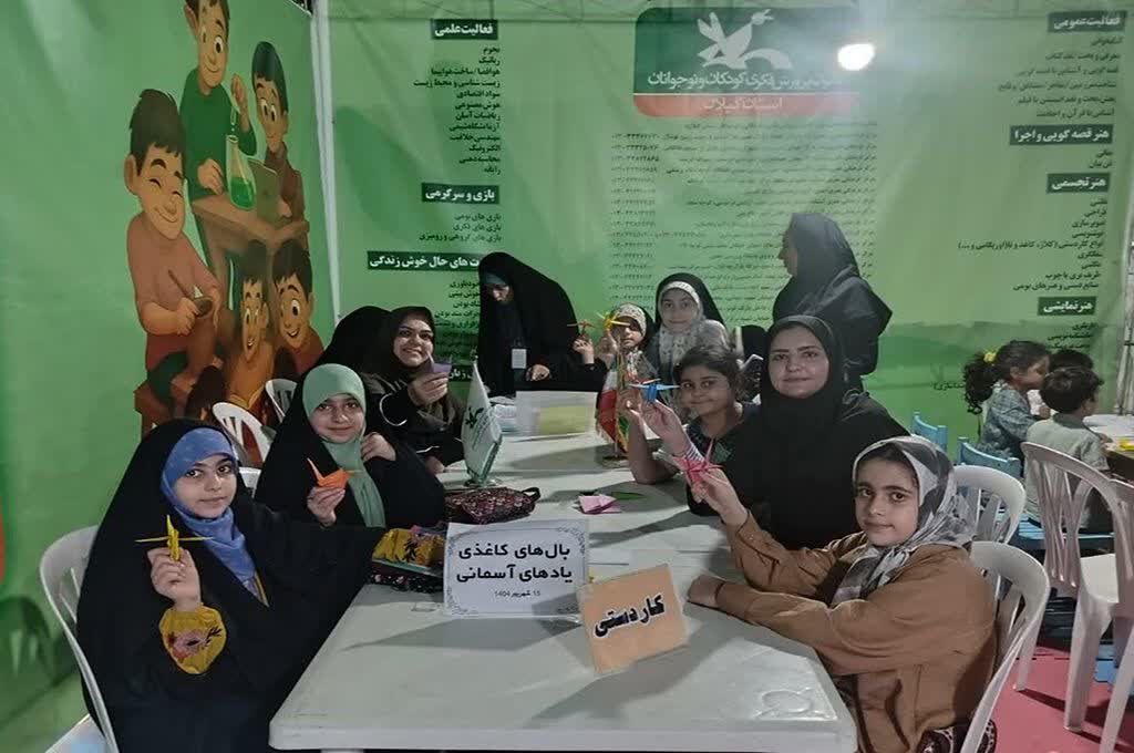 در این بخش، مربیان کانون پرورش فکری کودکان و نوجوانان استان گیلان به همراه شرکتکنندگان، به ساخت درنا و موشک کاغذی پرداختند و از سیره عملی و جانفشانیهای شهدای والامقام ایران اسلامی صحبت کردند.
